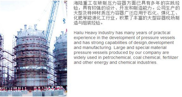 蘇州海陸重工股份有限公司位于江蘇省張家港市開發(fā)區,是國內一流的節(jié)能環(huán)保設備的專業設計制造企業,目前并已初步形成鍋爐產品、大型壓力容器、核電設備、低溫產品、環(huán)保工程共同發(fā)展的業務格局。公司創(chuàng)建于1956年,注冊資本51640萬元,占地面積近50萬平米。公司下設八個控股子公司,一個余熱鍋爐研究所,在瑞士、北京、武漢、南京、上海、杭州、廣州等地設立分支機構,擁有雄厚的研發(fā)實力。公司秉承“科技領航、業界先鋒”的發(fā)展理念,注重研究廢熱、余熱利用和環(huán)境保護相結合的新技術研發(fā),自主設計能力居同行前列;公司承擔過國家863計劃,江蘇省科技成果轉化專項資金,榮獲國家科技進步二等獎,產品擁有核心自主知識產權并取得專利50多項;公司推行國際先進的管理體系標準和認證,擁有 A級鍋爐制造許可證,A1、A2、A3級壓力容器設計和制造許可證,取得了民用核承壓設備制造資格許可證、美國機械工程師學會(ASME)“S”、“U”鋼印,通過了ISO9001質量體系認證、健康體系認證和14000環(huán)境體系認證;公司設備先進,裝備精良,專業嚴謹的制造理念打造出品質非凡、質量一流的“海陸”品牌聲譽。